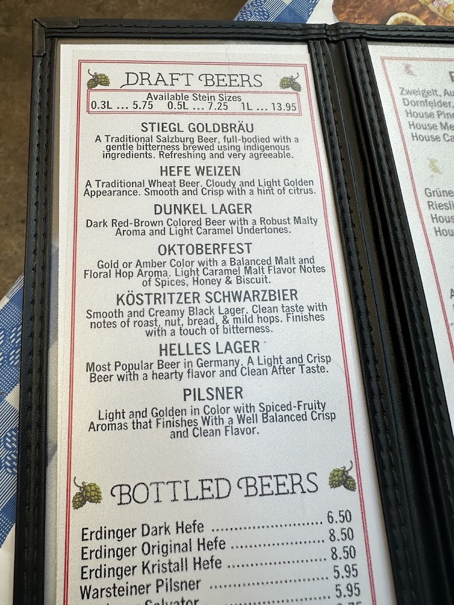 Beverages include a selection of beers such as Dunkel Lager, Ayinger Century Beer, and Weisse Bier, alongside non-alcoholic choices like Root Beer and infused vodka. The menu also features beer cocktails like Bier Und Radler.